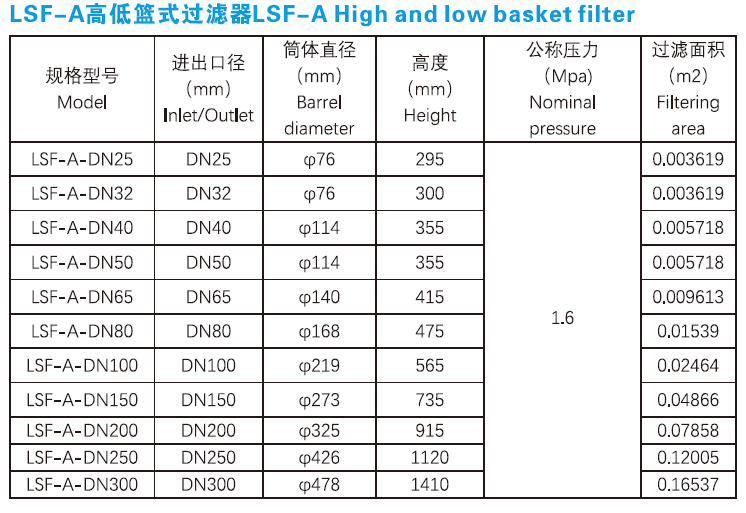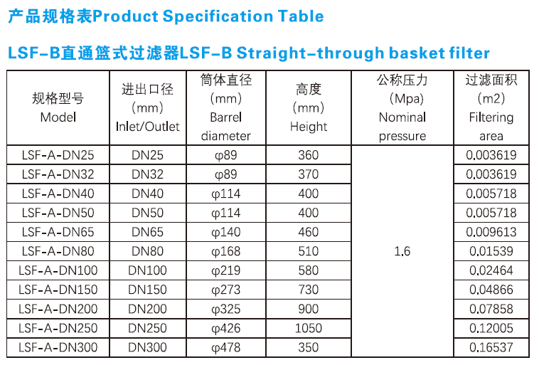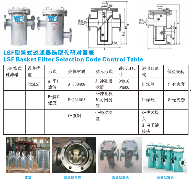 LSF basket filter is a small equipment for removing a small amount of solid particlesin liquid, which can protect compressors, pumps, instruments and other normal work.When the fluid enters the filter barrel with a certain specification, its impuritiesare blocked, while the clean filtrate is discharged from the outlet of the filter.When cleaning is needed, only removable filter barrel is taken out and re-loaded aftertreatment. It is very convenient to use and maintain.