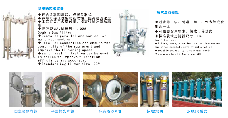 DSF型袋式过滤器是一种结构新颖、体积小、操作简单、灵活、节能、高效、密闭工作、适应性强的多用途过滤设备。袋式过滤机主要有过滤筒体、快开机构、滤袋加强网、滤袋等主要部件组成。该系列过滤机是一种压力式过滤装置。原液由进料口流入装置在加强网内的滤袋,受压,合格品渗透滤袋,由出料口排出,进入下道工序,杂质颗粒被滤袋捕捉。整个过程高效、简便,且更换滤袋方便。