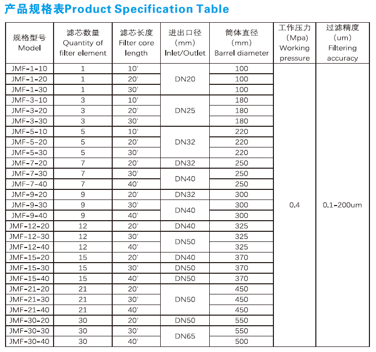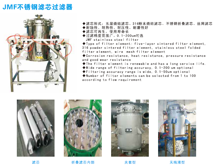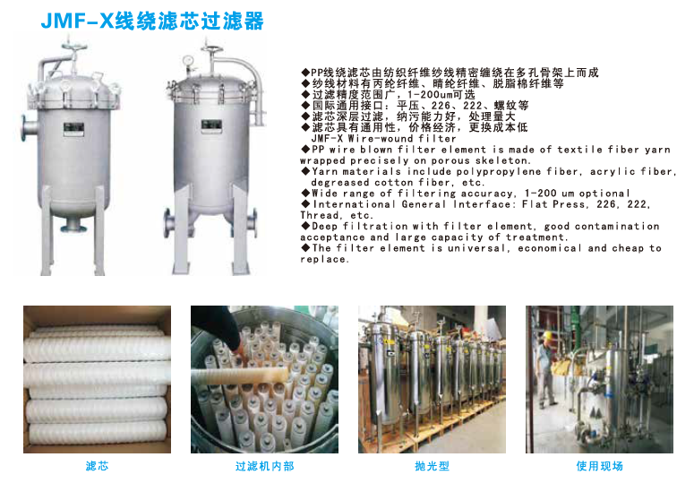 JMF filter core type filter is to press the liquid to be filtered into the filterinlet, through the filter core from the outside to the inside, and then filtered intoclear liquid, and then discharged through the outlet. Impurities are trapped in thedeep layer and surface of the filter element, so that the liquid can be filtered. JMFfilter is a kind of precise filter, which intercepts tiny magazines and bacteria. Ithas the characteristics of high precision, high filtration efficiency and large contamination tolerance.