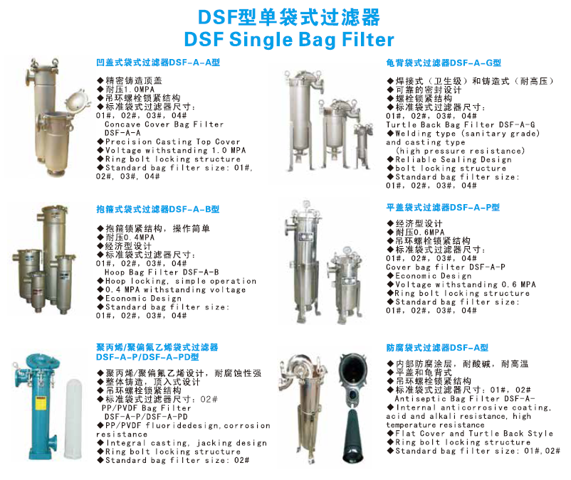 DSF bag filter is a multi-purpose filter equipment with novel structure, smallvolume, simple operation, flexibility, energy saving, high efficiency, closed operationand strong adaptability. Bag filter mainly consists of filter cylinder, quick openingmechanism, filter bag reinforcement net, filter bag and other main components. Thisseries of filters is a pressure type filter device. Raw liquor is flowed into the filterbag in the reinforcing mesh by the inlet and outlet device. Under pressure, the qualifiedoroduct is permeated into the filter bag. It is discharged from the outlet and enters thenext process. Impurity particles are captured by the filter bag. The whole process isefficient, simple and easy to replace the filter bag.