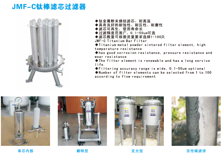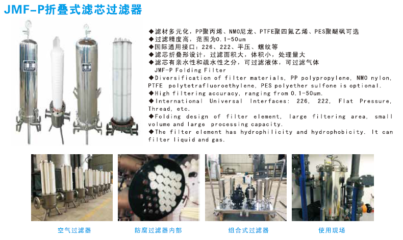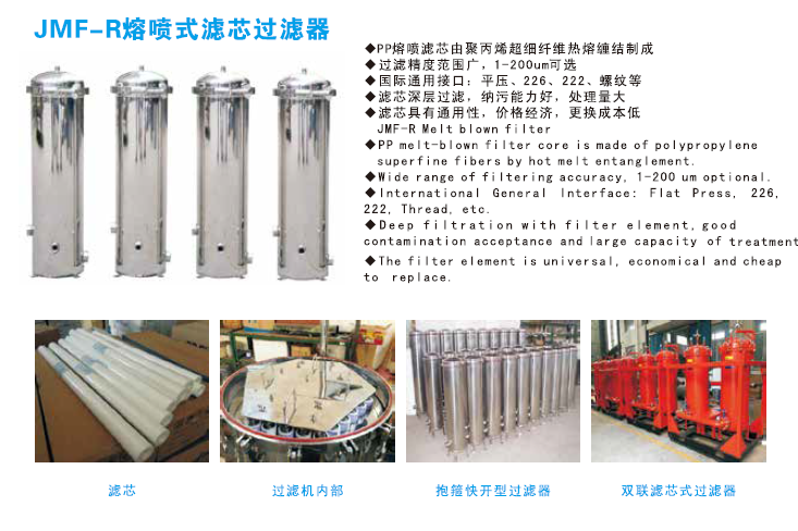JMF filter core type filter is to press the liquid to be filtered into the filterinlet, through the filter core from the outside to the inside, and then filtered intoclear liquid, and then discharged through the outlet. Impurities are trapped in thedeep layer and surface of the filter element, so that the liquid can be filtered. JMFfilter is a kind of precise filter, which intercepts tiny magazines and bacteria. Ithas the characteristics of high precision, high filtration efficiency and large contamination tolerance.